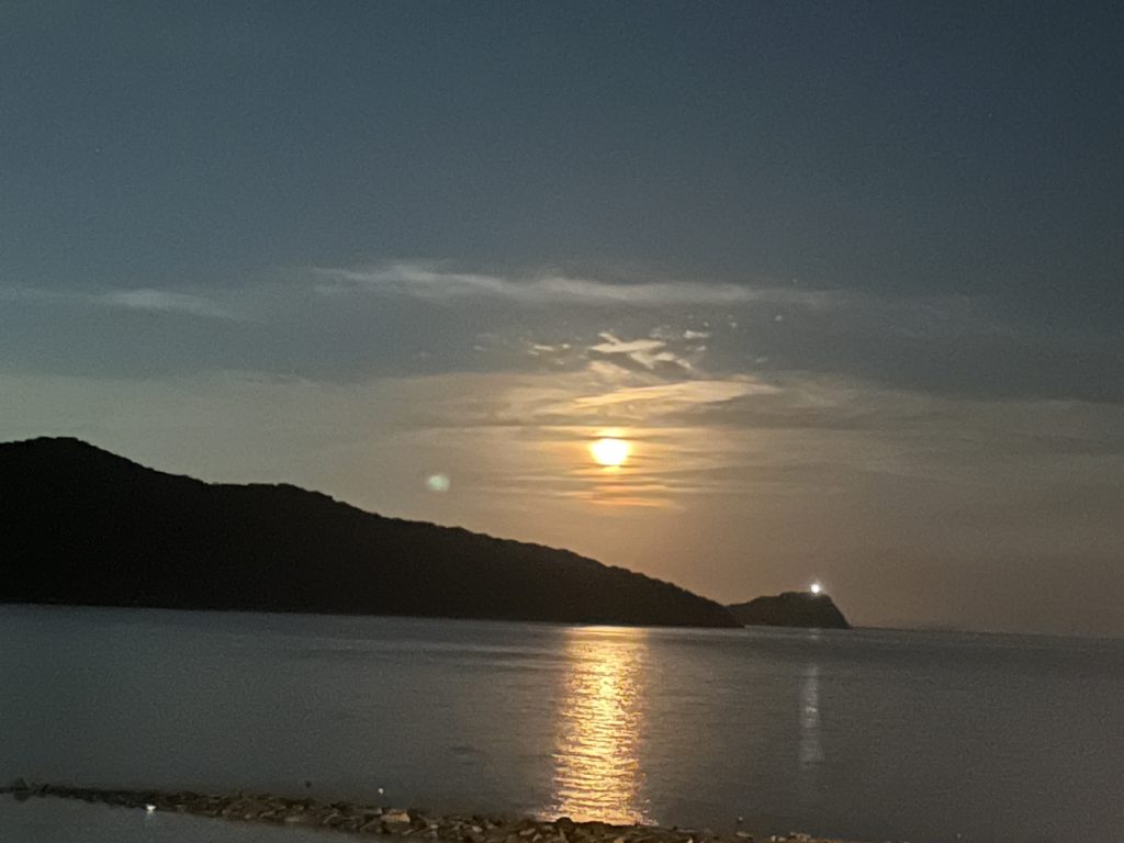 月夜の海に灯台の灯りが水面に反射して、ニ本の光の道が延びていた。